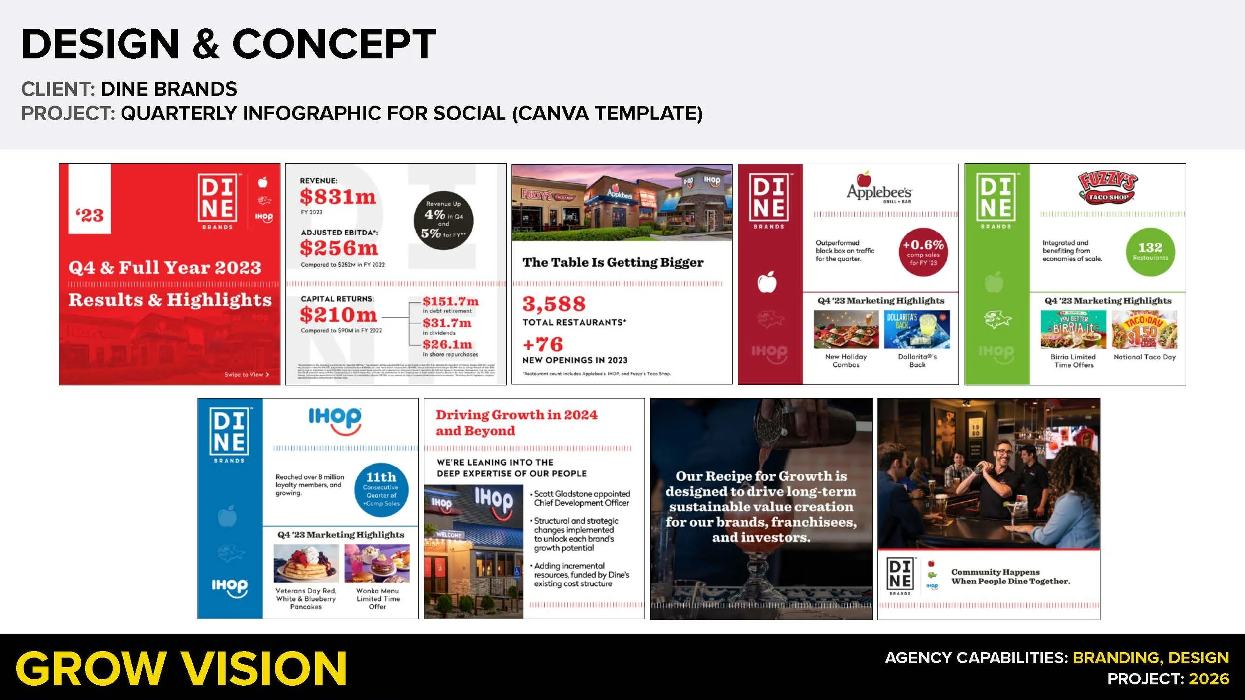 At the parent company level, Grow Vision develops brand design and creative assets for Dine Brands corporate — including Canva templates for quarterly reporting, LinkedIn communications, and internal brand materials. Clean, on-brand, built to work across every format the corporate team needs.